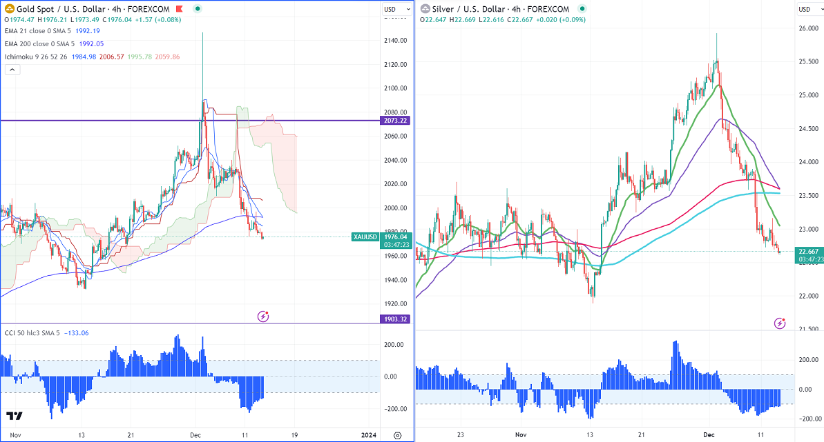 US Nov CPI came in line with expectations, with headline CPI coming at 0.10% m/m and core inflation rising at 0.30%. While yearly headline inflation declined to 3.1% from 3.2% the previous month. Markets eagerly await the Fed statement and dot plot for further direction. Any dovish comments from the Fed will push gold prices higher above the $2000 level.