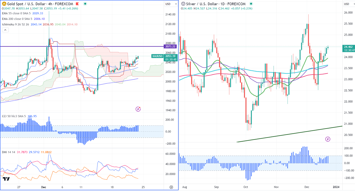 Gold trades higher after weak US economic data. US real GDP came at 4.9% for the third quarter, below the estimate of 5.2%. The number of people who have filed for unemployment benefits rose by 2000 last week vs an estimate of 214K. US Philadelphia manufacturing index declined to -10.5 in Dec vs. 3 expected. It hit a high of $2055 at the time of writing and is currently trading at around $2052.91