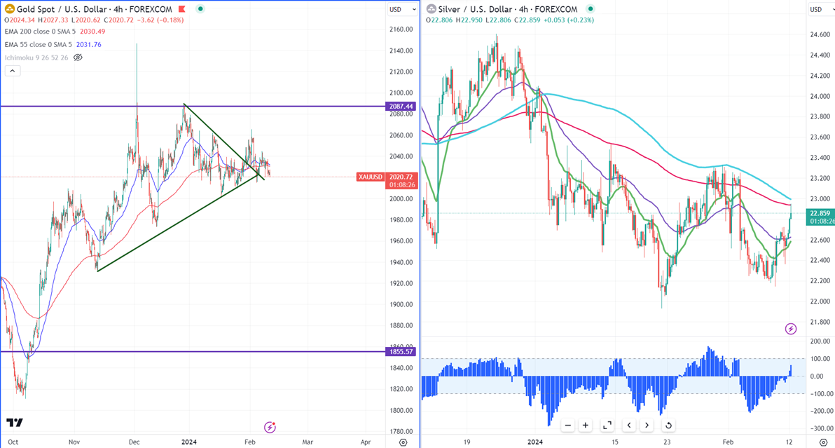 Gold has traded in a narrow range between $2014 and $2044.61 for the past week. The upbeat US services PMI and hawkish comments from Fed officials on rate cuts put pressure on the yellow metal. The yellow metal hit a low of $2020 at the time of writing and is currently trading around $2024.46.