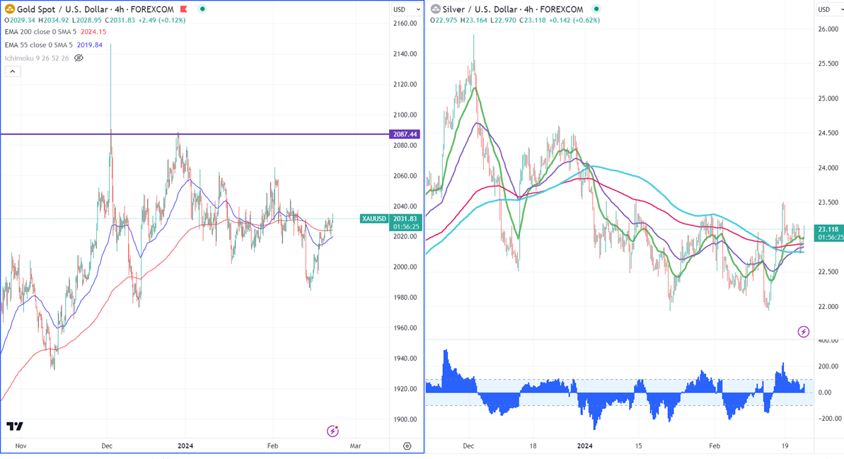Gold gained momentum despite the hawkish US fed. The Fed meeting minutes confirm that the central bank will not go for an early rate cut till inflation eases. The yellow metal hit a high of $2032.15 at the time of writing and is currently trading around $2031.97.