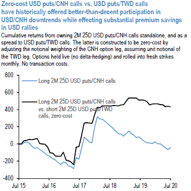 Owning USDCNH puts financed with USDTWD puts is a premium efficient way of positioning for conditional USD weakness – conditional because both options stand to expire worthless and leave no P/L trace if constructed in zero-cost format should an intensification of US – China tensions lead to an abrupt and material weakening of the Asian FX complex.