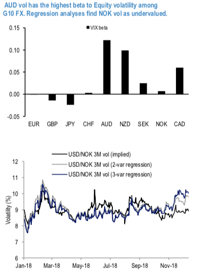 Given the sensitivity of the currency to Oil prices, in the bottom chart (zooming on 2018 data) we compare USDNOK implied vol with two fair value regressions, one using the two factors described above, one incorporating Oil volatility as a third regressor. NOK volatility is undervalued in both (2- and 3-factor) regressions by around 1vol, having failed to react to a sharp rise in Oil volatility (to which it is positively exposed) in early November. Courtesy: JPM