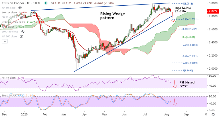 Price action has dipped below strong support at 21-EMA raising scope for further downside.