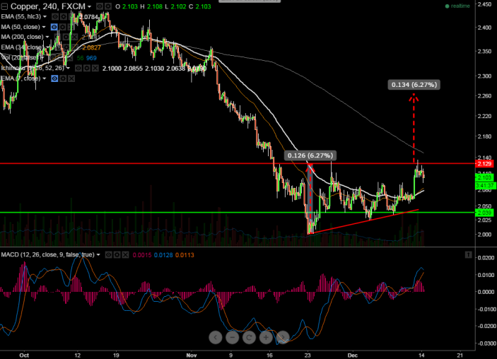 - Copper has made a high of 2.135 and slightly retreated from that level. It is currently trading around 2.105.