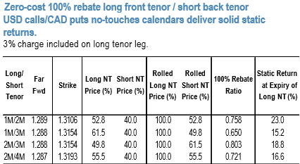 At the current market, the strategy collects solid static returns in case of USDCAD (+1M/-2M 23% of the 2M leg notional of static return –i.e. if spot stays unchanged after 1M –at expiry of the long no-touch leg).