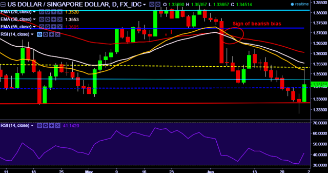 We prefer to take long position in USD/SGD around 1.3375, stop loss 1.3310 and target 1.3535/ 1.3622 marks.