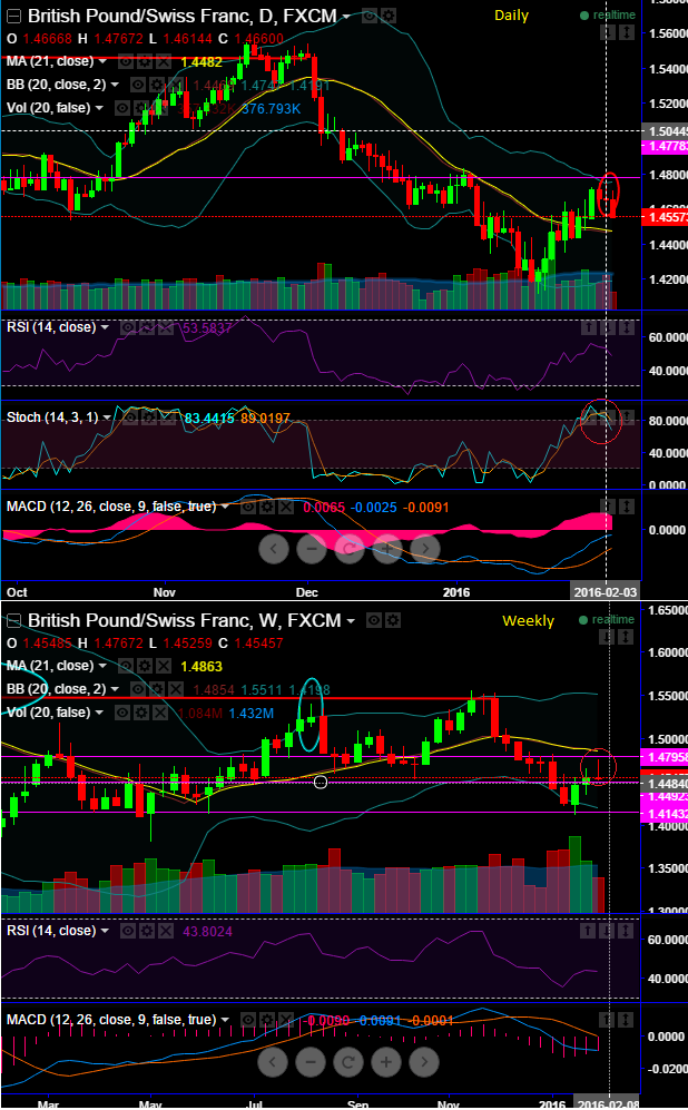 Technicals on all time frames raise a caution for ongoing short term uptrend as previous upswings have not been able to break above resistance levels at 1.4778, instead formed a gravestone doji at 1.4660 (see circled spots in red) that has evidenced steep slumps today.