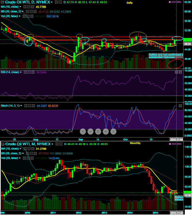 WTI crude is attempting to beach resistance at 48.10 levels which has already tested this level as crucial point of demand and supply several times in the past (see blue colored circled areas).