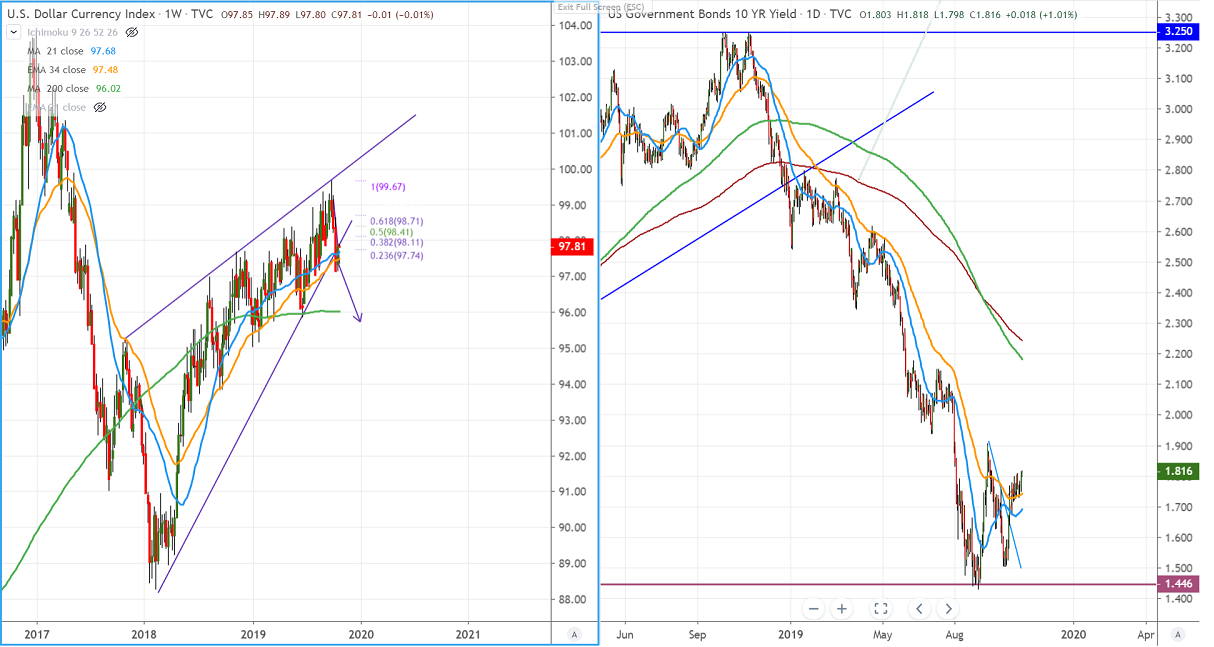 US 10-year yield continues to trade higher for 3rd consecutive week and break above 1.907% will take it further up till 2%. The spread between US 10-year and 2-year has widened to 17.9 bps.