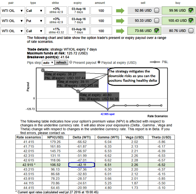 Go long in 3M At the money delta put of WTI crude, Go long 6M at the money delta call of WTI crude and simultaneously, Short 1M (1.5%) out of the money call of WTI crude with positive theta.