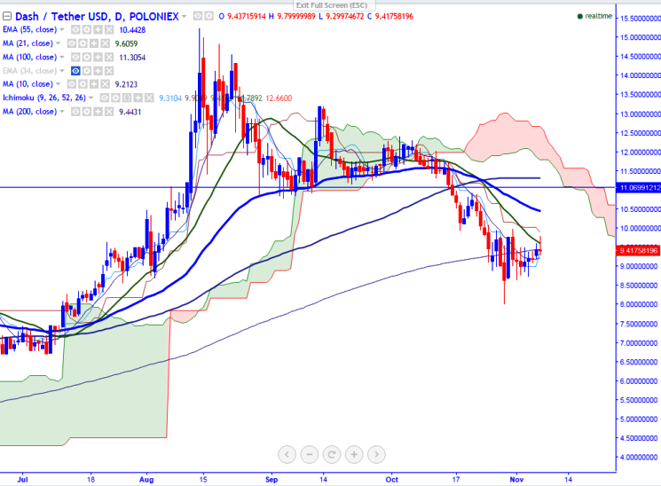 DASH/USDT breaks slightly above 200 –day MA and jumped till USDT9.799 levels (Poloniex). It is currently trading around USDT9.48 at the time of writing.