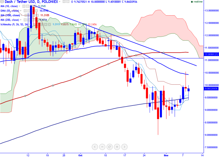 DASH/ USDT pair has made a high of USDT10.54 and started to decline from that level (Poloniex). It is currently trading around USDT9.84 at the time of writing.