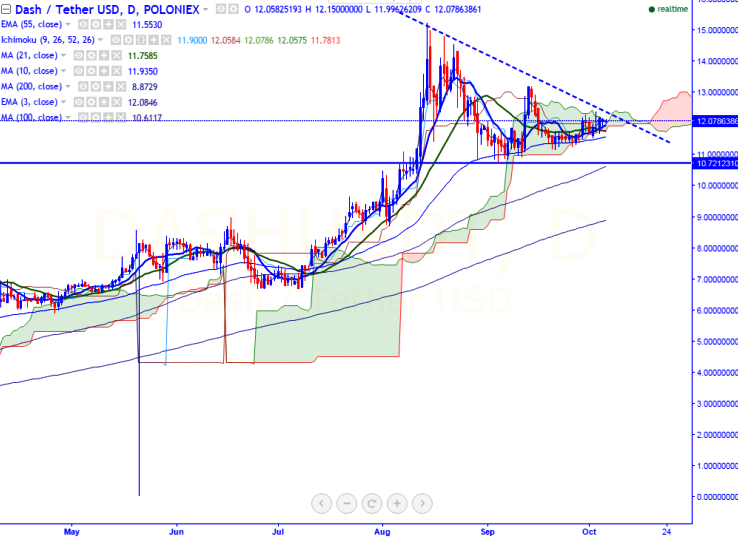 The pair has jumped slightly on Thursday after declining till USDT11.85 yesterday (Poloniex). It is currently trading around USDT12.07 at the time of writing.