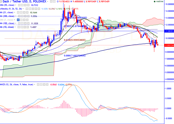 DASH/USDT has declined sharply after hitting USDT9.98 levels (Poloniex). It is currently trading around USD9.01 at the time of writing.