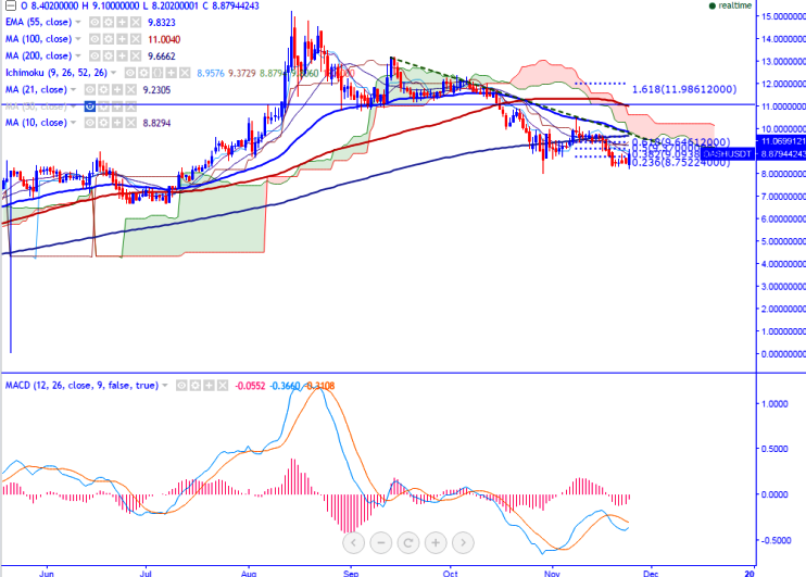 Major resistance is around USDT9.10 and any break above targets USDT9.24 (21- day MA)/USDT9.65 (200- day EMA). Short term support is seen at USDT8 (Oct 29th low) and any break below targets USDT6.70 (7th Jul low).