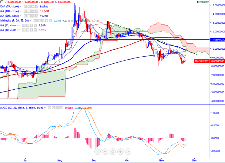 DASH/USDT is seen trading well below on Wednesday. The pair has shown a slight recovery till USDT8.899 and started to decline from that level (Poloniex). It is currently trading around USDT8.69 at the time of writing.