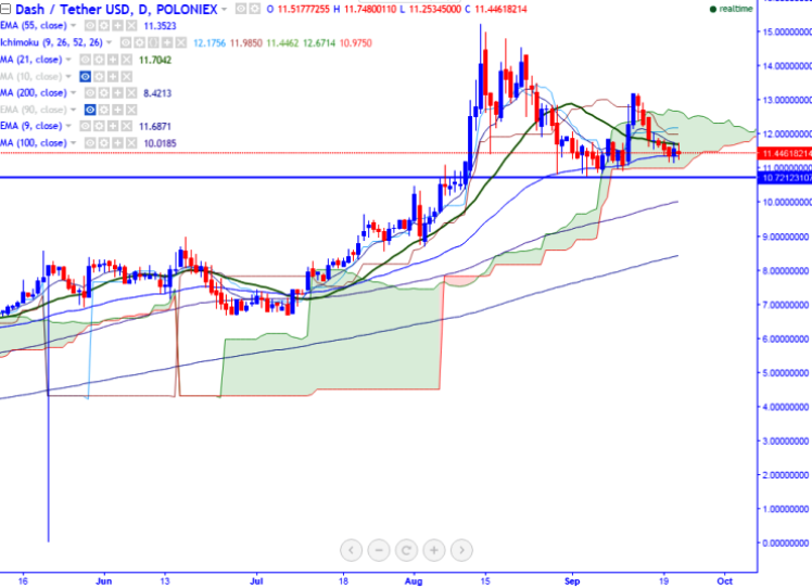 Major resistance is around USDT11.74 (9- day EMA) and any break above targets USDT12.17 (daily tenken-Sen) /USDT13.20 (Sep 13th high). Short term support is seen at USDT10.77 (Sep 4th 2016 low) and any violation below will drag the pair down USDT10.56 (90- day EMA)/USDT9.94 (100- day MA).