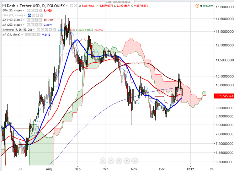 DASH/USDT has recovered slightly till USDT9.95 from the low of USDT9.10 made yesterday (Poloniex). It is currently trading around USDT10.24 at the time of writing.