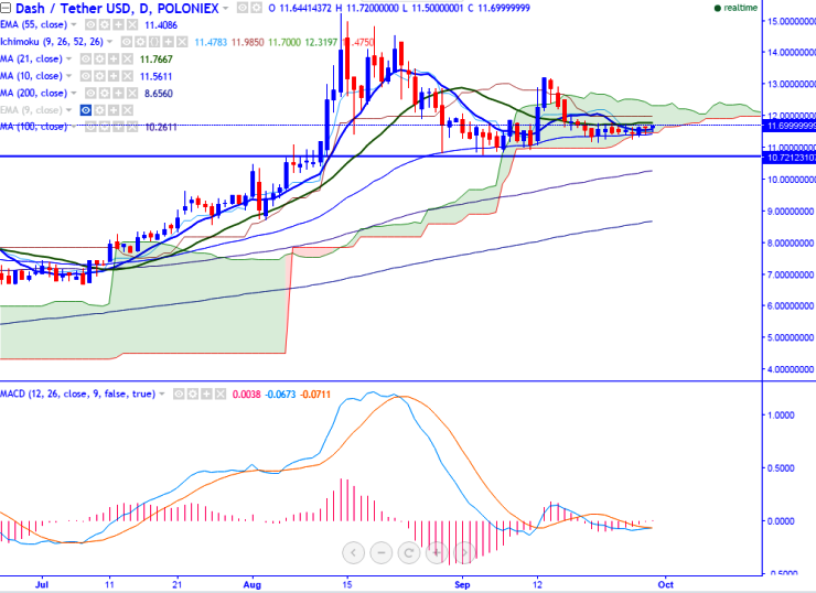 Major resistance is at USDT11.77 (21- day MA) and any break above targets USDT11.98 (daily Kijun-Sen)/USDT13.20 (Sep 13th high). Short-term support is seen at USDT10.77 (Sep 4th 2016 low) and any violation below will drag the pair down USDT10.56 (90- day EMA)/USDT9.94 (100- day MA).