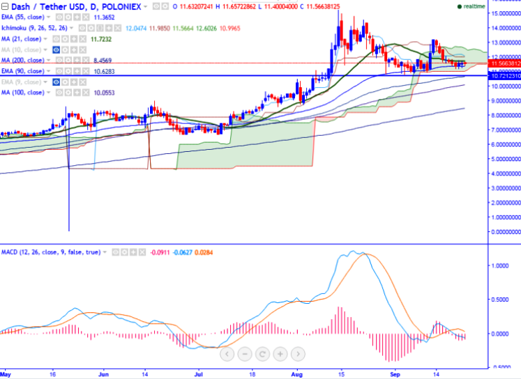 Major resistance is around USDT11.72 (21- day MA) and any break above targets USDT12.17 (daily tenken-Sen)/USDT13.20 (Sep 13th high). Short term support is seen at USDT10.77 (Sep 4th 2016 low) and any violation below will drag the pair down USDT10.56 (90- day EMA)/USDT9.94 (100- day MA).