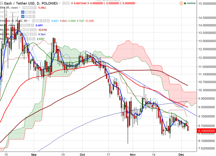 DASH/USDT is seen trading below on Monday. The pair has declined slightly after jumping till 8.95 yesterday (Poloniex). It is currently trading around USDT8.50 at the time of writing.
