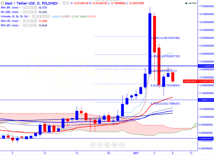 DASH/USDT is seen trading below in red on Monday. The pair has declined after making a slight jump till USDT13.14 levels (Poloniex). It is currently trading around USDT12.66 at the time of writing.