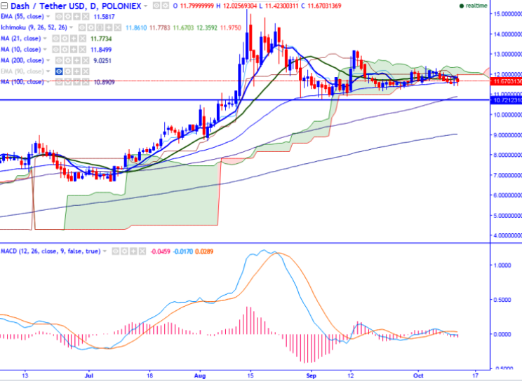 Major resistance is around USDT12 and any break above targets USDT12.48 (38.2% retracement of USDT15.24 and USDT10.77)/USDT13.20 (Sep 13th 2016 high). Short-term support is seen at USDT11.40 and any break below targets USDT11.15 (4th Sep low).