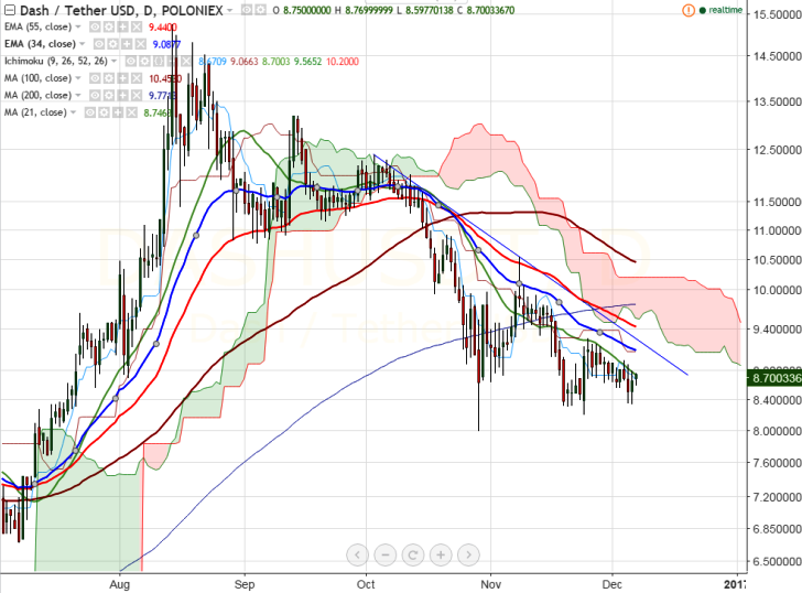 DASH/USDT has formed a minor bottom around USDT8.30 and slightly recovering from that level (Poloniex). It is currently trading around USDT8.70 at the time of writing.