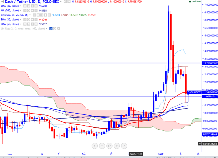 DASH/USDT has broken major support at USDT11.32 (30- day EMA) and declined till USDT10.63 yesterday (Poloniex). It is currently trading around USDT11.34 at the time of writing.