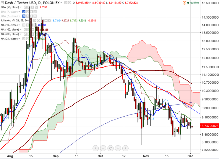 DASH/USDT is seen trading below in red on Friday. The pair is trading in a narrow range between 9.26 and 8.64 for the past seven trading days (Poloniex). It is currently trading around USDT8.630 at the time of writing.