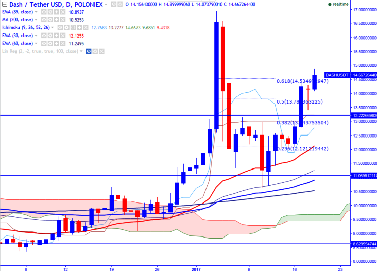 DASH/USDT is seen trading above on Thursday. The pair has broken a major resistance at USDT14.54 (61.8% retracement of USDT16.94 and USDT10.63) and jumped till USDT14.89 levels (Poloniex). It is currently trading around USDT14.57 at the time of writing.