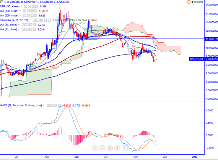 DASH/USDT is seen trading above on Tuesday. The pair has recovered slightly after declining till USDT8.31.It is currently trading around USDT8.89 at the time of writing.