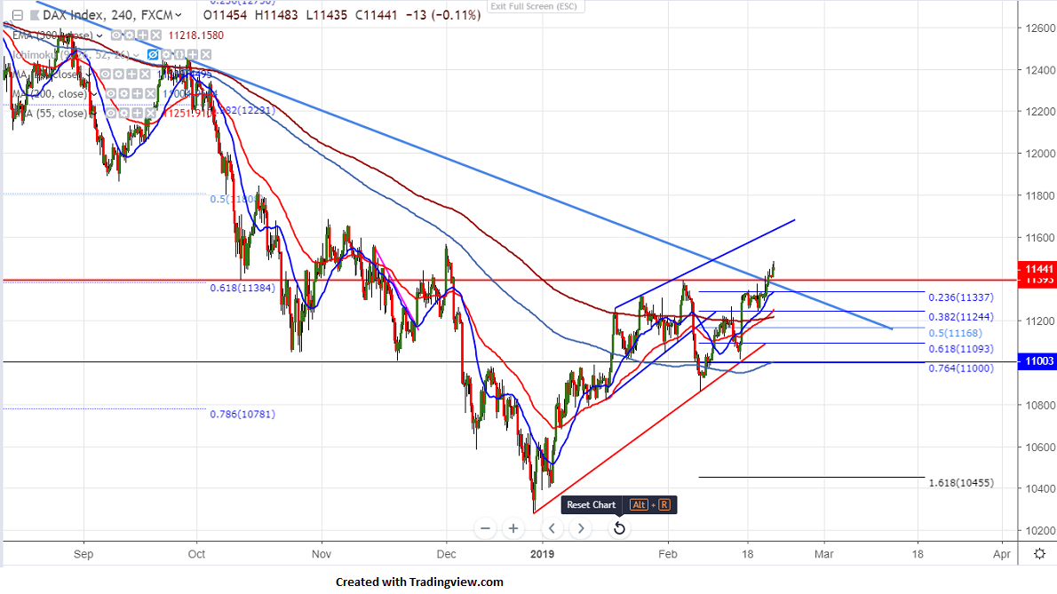 DAX30 is trading higher after breaking major resistance 11390 high made on Feb 5th 2019 on account of US-China trade talk optimism and strong global market. The index recovered sharply more than 600 points from low of 10862 made on Feb 8th 2019 almost 2 weeks. It is currently trading around 11463.