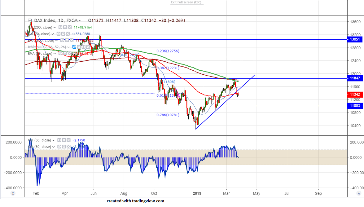 DAX has halted its 2-1/2 month uptrend and trading lower for past 5 trading days on account global stock market turmoil and declining bond yield. US 10 year yield hits 2.37% lowest level since Dec 2017.The index formed temporary top around 11827 and declined more than 500 points.It hits low of 11276 yesterday and is currently trading around 11330.