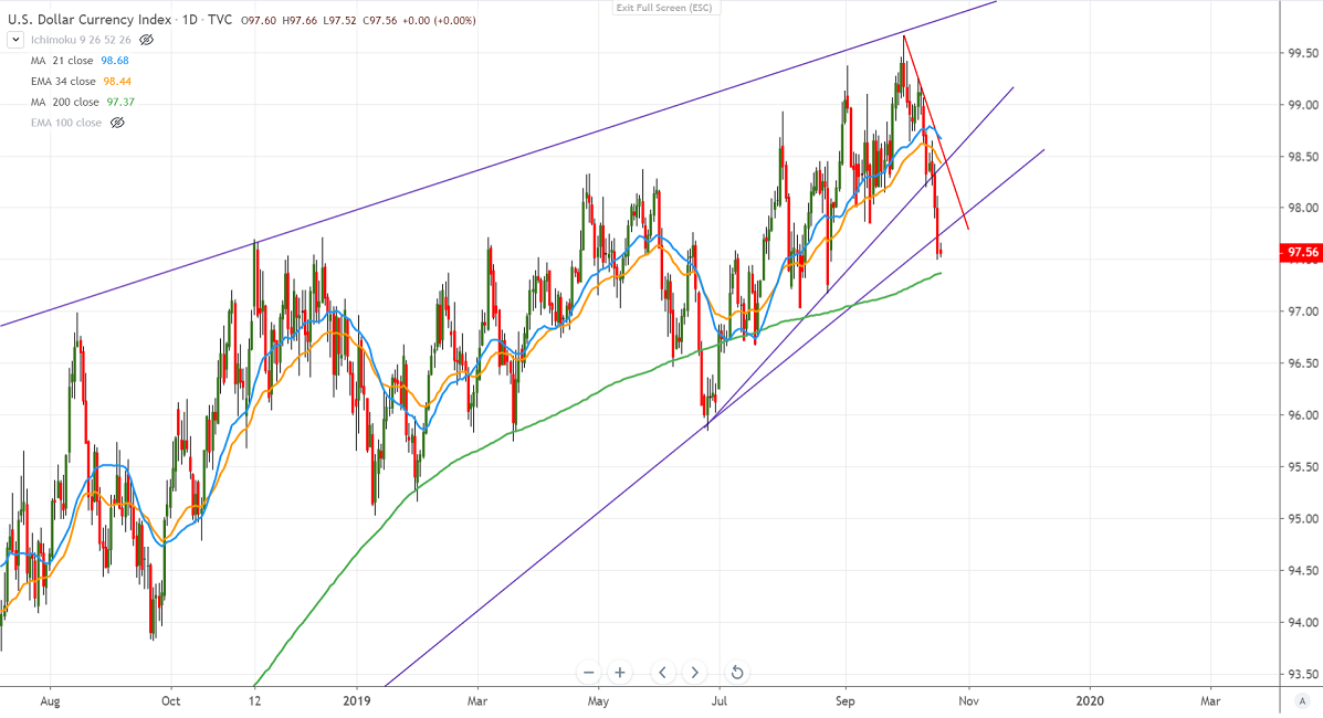 DXY is trading weak for past 6 days and lost more than 150 pips on weak economic data and easing of geopolitical tension is putting pressure on US dollar. Euro jumped against all majors after EU and UK have agreed for a new Brexit deal. US retails sales and Philly fed manufacturing index data came this week was much weaker than expected. The index hits a low of 97.50 and shown a minor recovery till . The weakness in US retail sales has increased the chance of rate cuts by the Fed. Markets eye US Philly fed manufacturing for further direction.