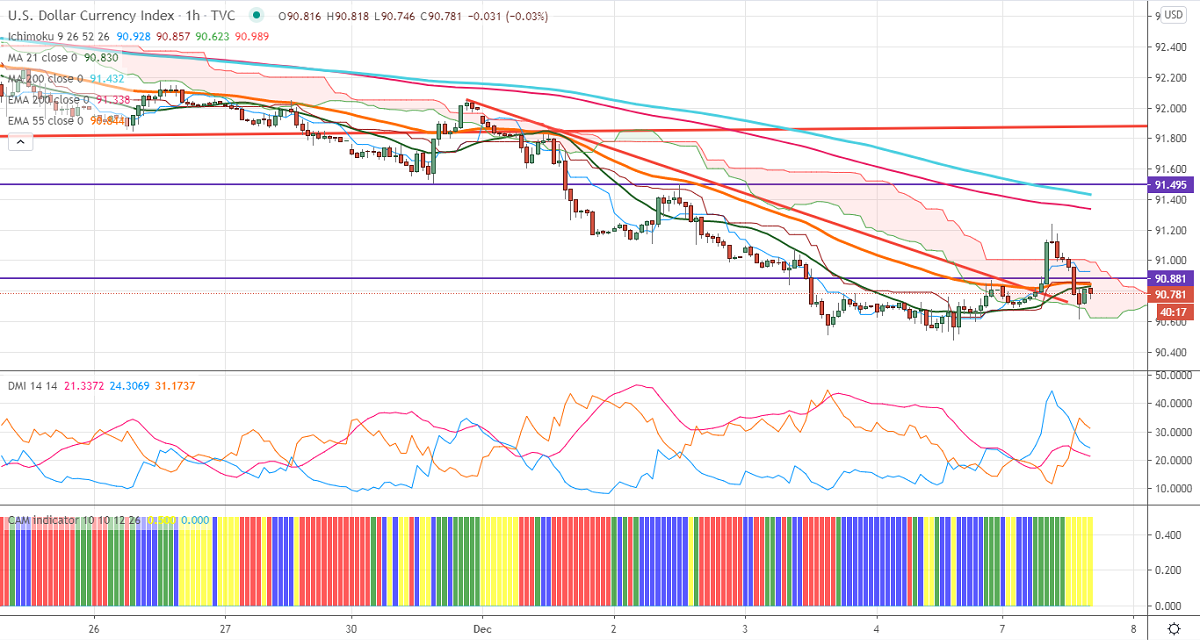 US Dollar index has started to decline after a minor recovery till 91.238. Short term trend is still bearish as long as resistance 91.50 holds. The index lost more than 10% in the past 9 months on vaccine optimism and US stimulus hopes. The economy has added 245K jobs in November compared to a forecast of 460K. The unemployment rate dipped to 6.7% from 6.8%. It hits an intraday high of 91.238 and is currently trading around 90.77.