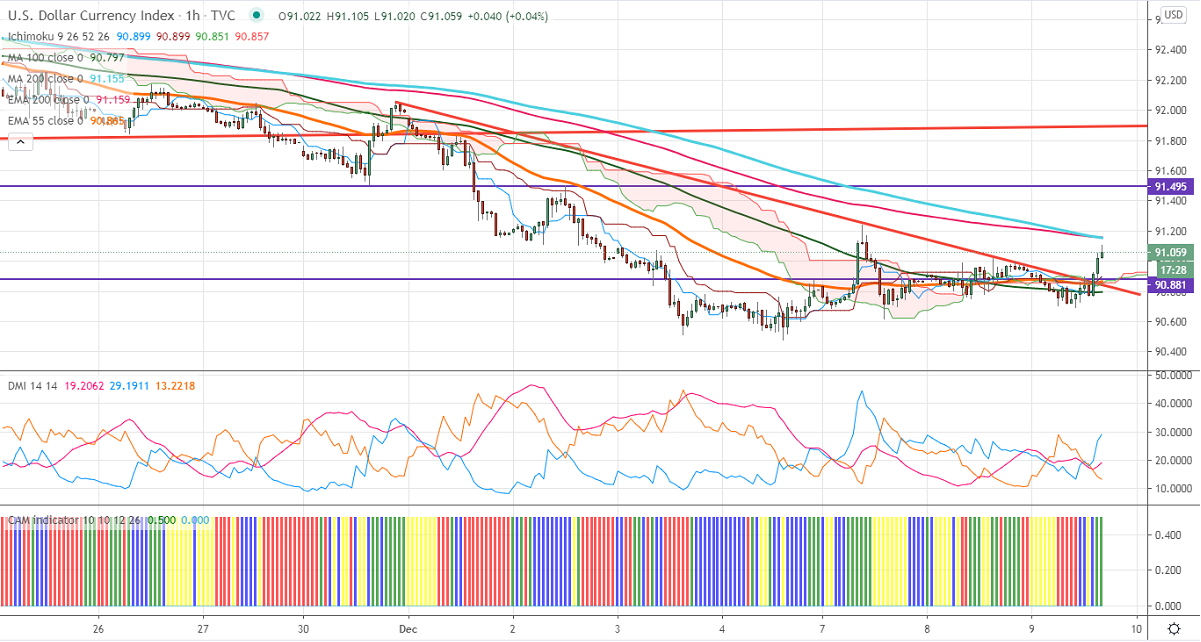 US Dollar index is trading higher for the past third consecutive days on Brexit and US stimulus uncertainty. UK PM Boris Johnson to meet European Commission President Ursula von der Leyen regarding the Brexit deal. Short term trend on DXY is still bearish as long as resistance 91.50 holds. The index lost more than 4% in the past 6 weeks on vaccine optimism. Markets eye US CPI and jobless claims data tomorrow for further direction. It hits an intraday high of 91.10 and is currently trading around 91.10