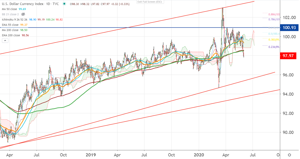 US Dollar index continues to trade weak for 4th consecutive days and lost more than 200 pips till 97.81. The decline was mainly due to weak US economic data released the previous month. US Durable goods orders plunged sharply to -17.2% in Apr, most since Aug2014. The number of people filed for unemployment claims came at 2123K in the previous week, the lowest level since the corona pandemic. US personal spending declined to record 16% in Apr MOM as the savings rate increased by 33%.