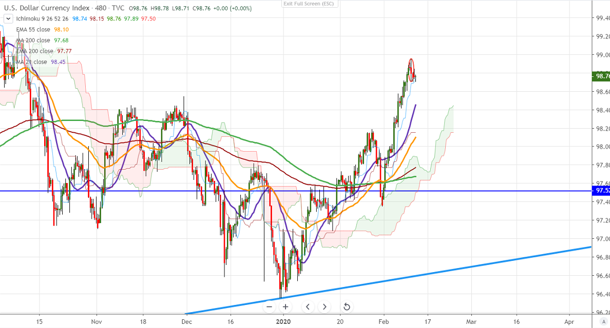US dollar index has halted its 2-month of the bullish trend and declined 25 pips from high 98.95. Fed Chairman Powell stated that the current policy is appropriate and coronavirus will affect the global economy. Markets eye US CPI and retail sales data for further direction.