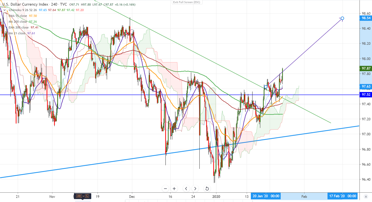 DXY trades higher and has broken major resistance 97.82 after a long consolidation. The jump was mainly due to weakness in EURUSD after dovish ECB. The index hits a high of 97.86 at the time of writing and is currently trading around 97.85.