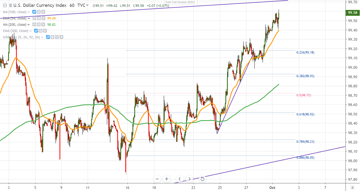 US dollar index continues to trade higher for 5th consecutive days and hits a fresh 28-month high. It hits a high of 99.59 and is currently trading around 99.59.