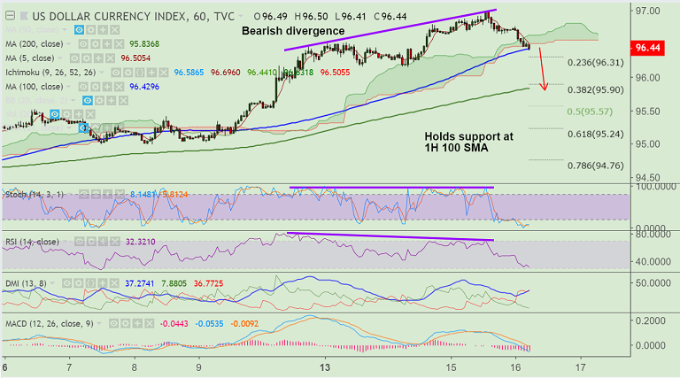 - Price is holding support at 1H 100-SMA at 96.42. Break below will see further weakness.
