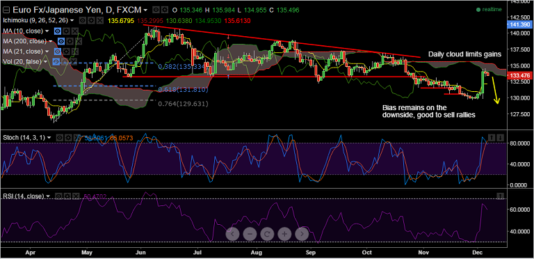 - EUR/JPY gains post ECB last week was halted by the daily cloud, the pair has hit lows of 133.44 on the day, after rejection at cloud base by 134.12
