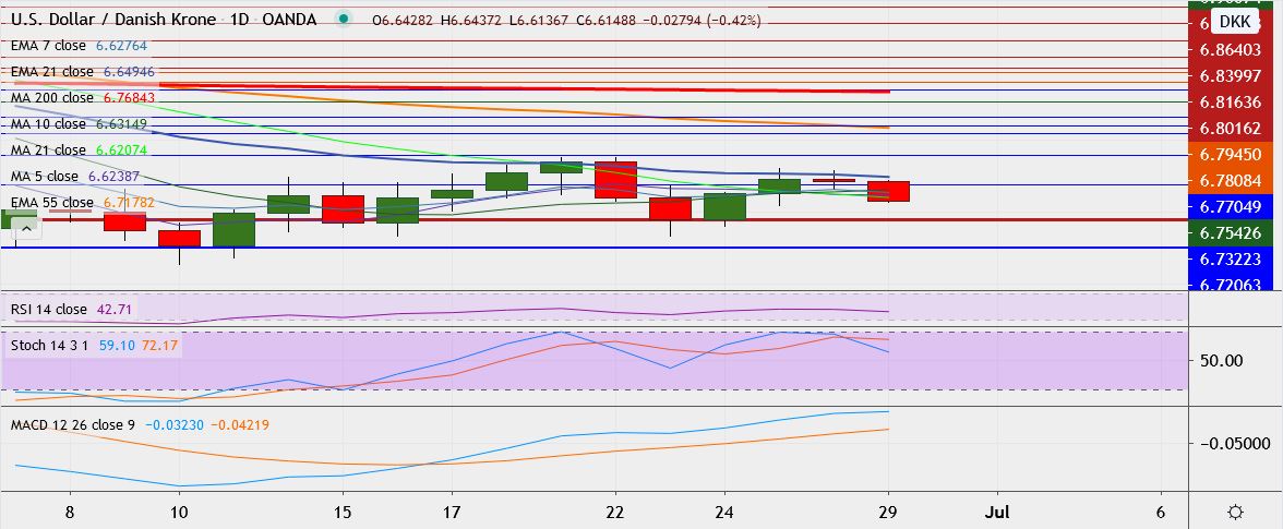 - USD/DKK is trading 0.4 percent down at 6.6161, having hit low of 6.5672 on Tuesday, its lowest since June 16.
