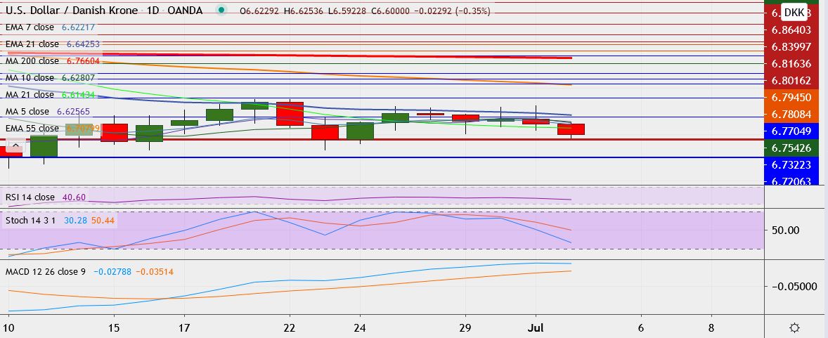 - USD/DKK is trading 0.3 percent down at 6.6011, having hit low of 6.5922 earlier, its lowest since June 24.