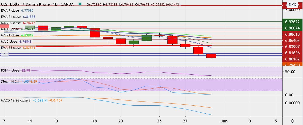 - USD/DKK is trading 0.3 percent down at 6.7064, having hit low of 6.7046 earlier, its lowest since March 31.