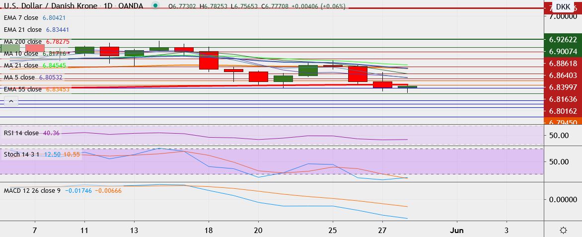 - USD/DKK is trading 0.1 percent up at 6.7795, having hit low of 6.7565 earlier, its lowest since March 31.