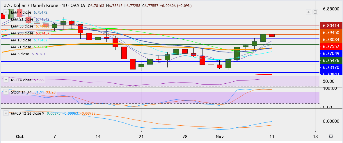 - USD/DKK is currently trading 0.1 percent down at 6.7749, having hit high of 6.7835 on Friday, its highest since October 15.