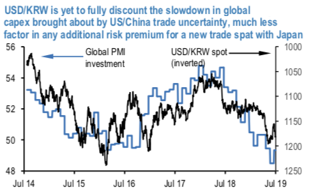 USDKRW has already undone three-quarters of its pre-G20 decline, but given the currency did not even fully discount, much less build in any risk premium for the global Capex slowdown prior to the eruption of the trade spat with Japan (refer above chart), the path of least resistance for the won is weaker.