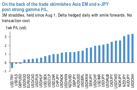 Spot gyrations generated strong gamma returns especially in Asia EM and x-JPY (refer 1st chart). How widespread and how impactful the trade escalation has been the best seen from the 1-week returns which are >90 percentile of YTD weekly returns for 26 out of 30 currencies in the Exhibit. We do not see a quick resolve and remain defensive though the current indications are that PBoC may want to bring back calm into FX.